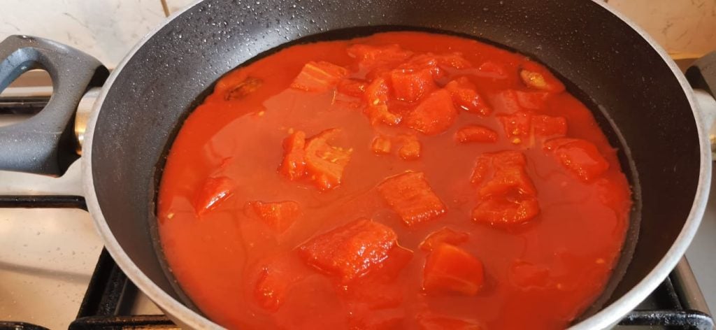 In derselben Pfanne, in der die Paprika gebraten wurden, und nach dem Entfernen derselben, einen ganzen Knoblauchzehe braten lassen, bis er goldbraun ist, die geschälten Tomaten in große Stücke geschnitten hinzufügen und kochen lassen.