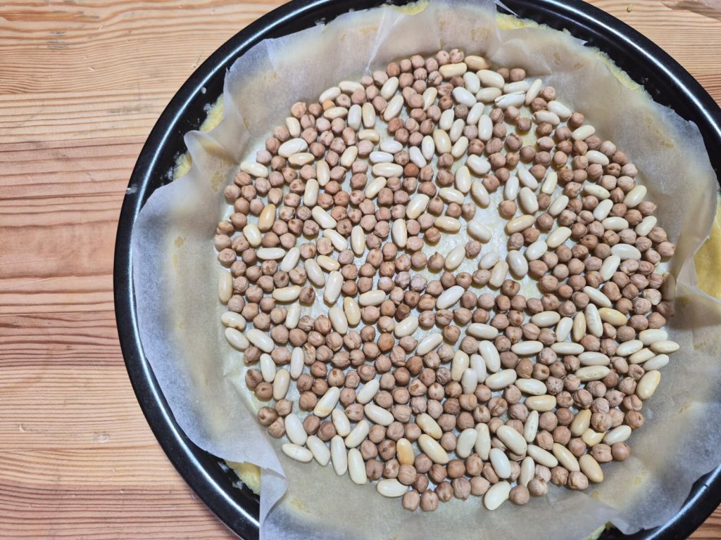 Blindbacken: Den Boden mit einer Gabel einstechen, mit Backpapier abdecken und mit getrockneten Bohnen oder Backgewichten füllen.