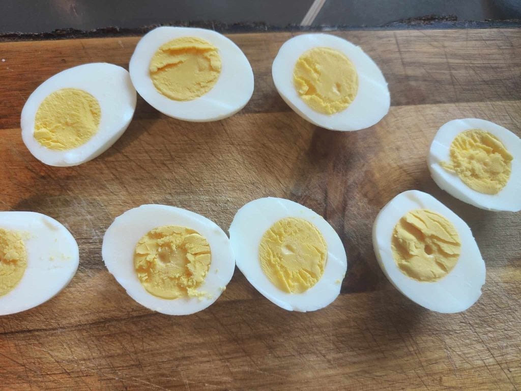 • Sobald die Eier geschält sind, mit einem scharfen Messer in Hälften schneiden.