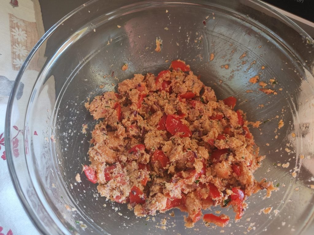 • In eine Schüssel geben Sie: das alte Brot, den geriebenen Parmesan, die fein gehackte Knoblauchzehe, die reifen Tomaten und mischen.