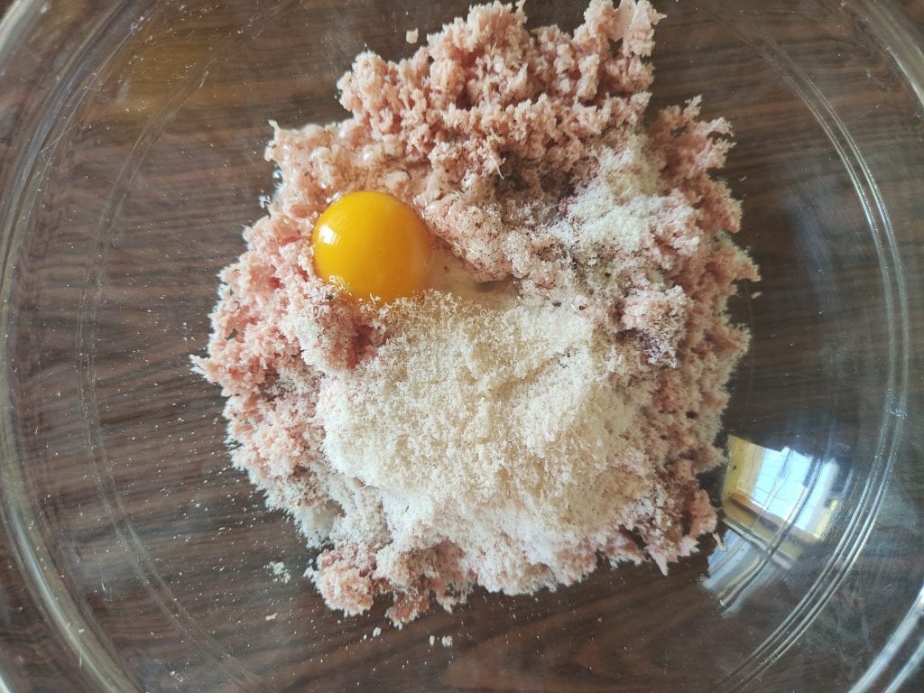 Nehmen Sie eine große Schüssel (zum Beispiel eine Salatschüssel) und geben Sie das Hackfleisch hinein, fügen Sie die fein geschnittene Mortadella, den geriebenen Parmesan und das Ei hinzu.