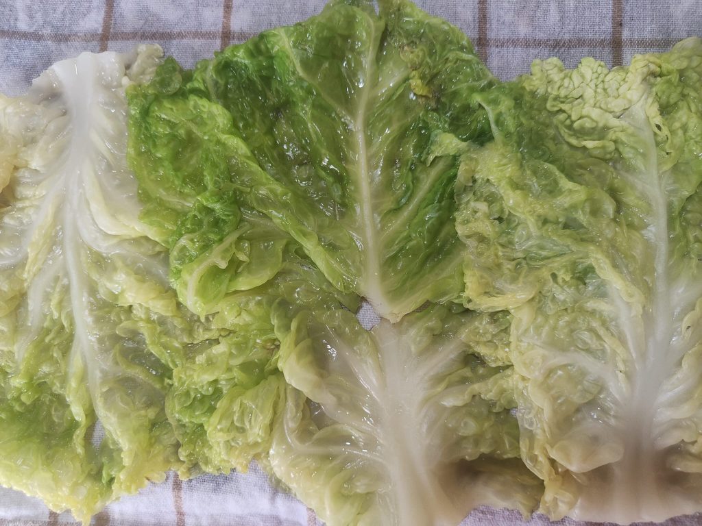 • Legen Sie das gekochte Wirsingblatt auf eine Arbeitsfläche und breiten Sie es gut aus.