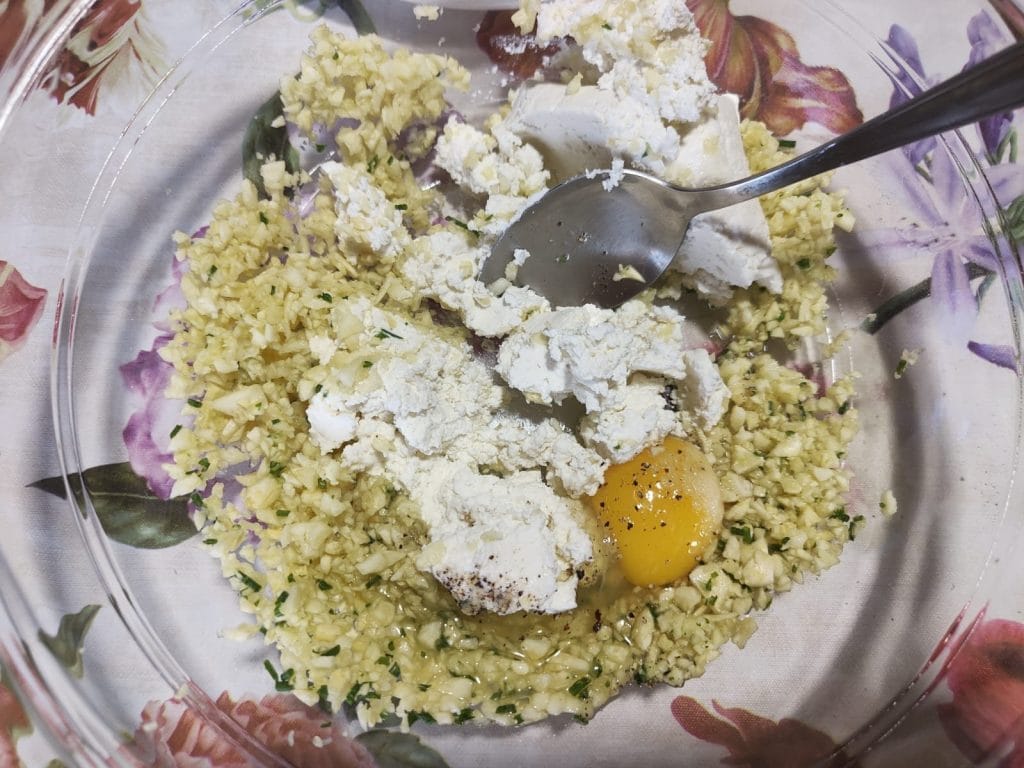In einer Schüssel mischen wir das gehackte Zucchinifleisch, den Ricotta, das Ei, den geriebenen Käse, die gehackte Petersilie und eine Prise Salz.