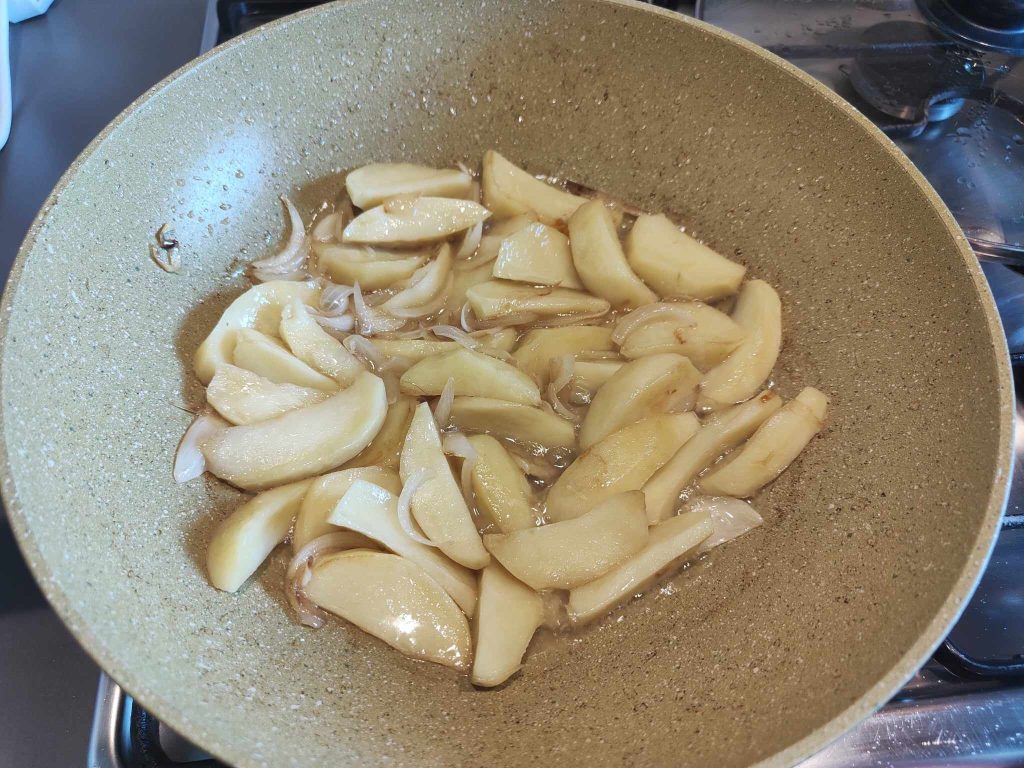 Lasse die fein geschnittene Zwiebel und die Knoblauchzehen anbraten, füge die geschnittenen Kartoffeln hinzu.