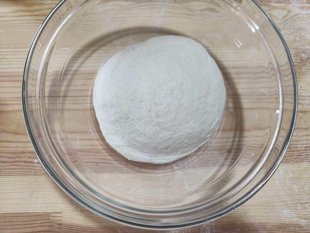 An diesem Punkt legen wir es wieder in die Schüssel, decken es mit Frischhaltefolie ab und lassen es bis zur Verdopplung gehen (es kann etwa 2-3 Stunden dauern, je nach Raumtemperatur).