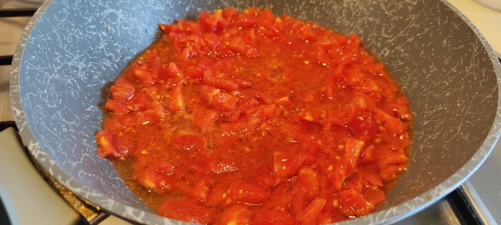 Die geschälten Tomaten, Basilikum hinzufügen und schmoren lassen.