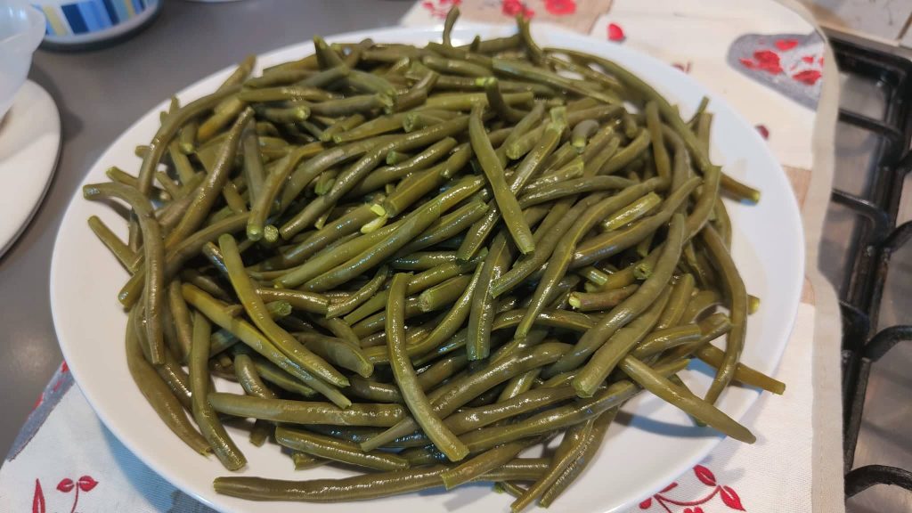 Die gekochten grünen Bohnen und eine Kelle frisches Wasser hinzufügen und etwa zwanzig Minuten köcheln lassen oder bis die gewünschte Konsistenz der Gemüse erreicht ist.Abschmecken und mit Salz nachwürzen.