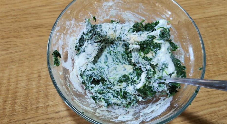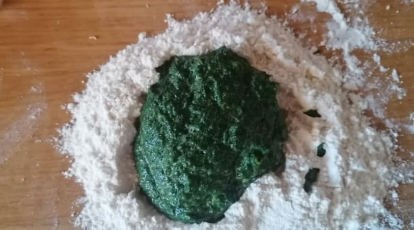 Die Mehle in einer Fontäne aufschütten und in der Mitte die Eier und den Spinat einfüllen.