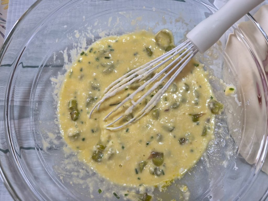 Nun die in Butter geschwenkten Spargelstücke zur Masse geben und gut vermischen.