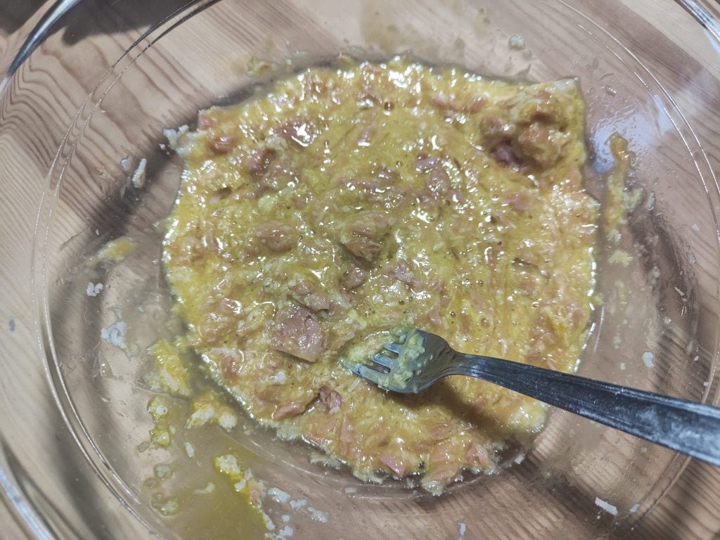 In einer großen Schüssel den abgetropften Thunfisch geben und grob mit einer Gabel zerdrücken.