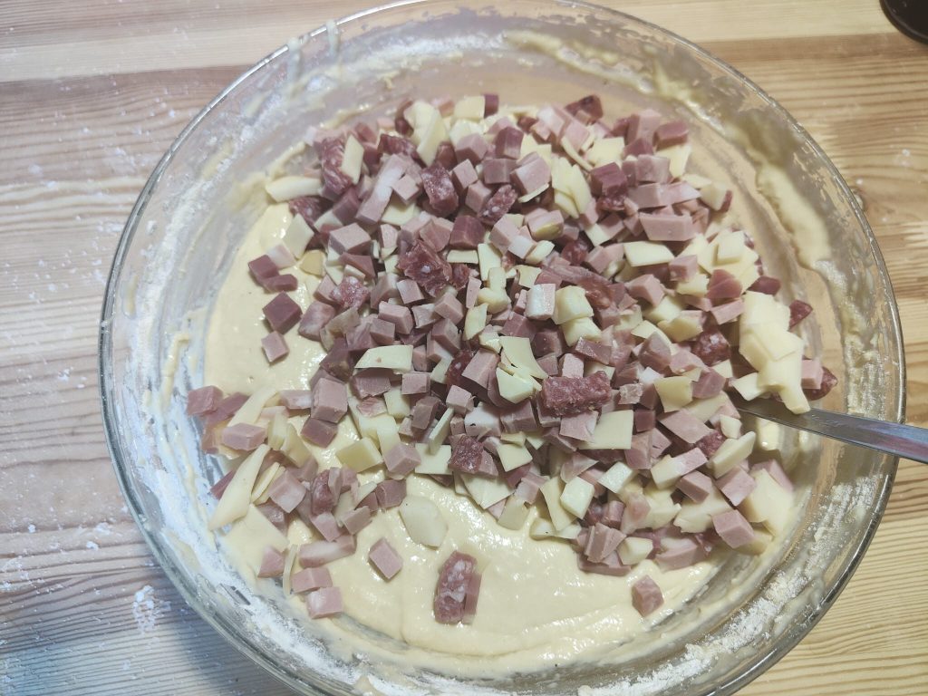 • Wenn Sie einen homogenen Teig erreicht haben, fügen Sie den Käse und die Wurstwaren hinzu
