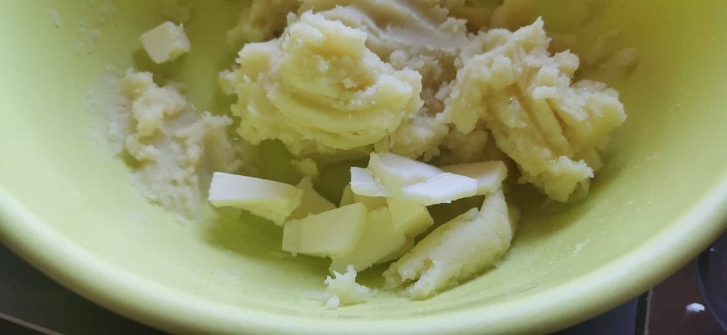 Sammeln Sie das Kartoffelpüree in einer Schüssel und formen Sie in der Mitte eine Mulde.