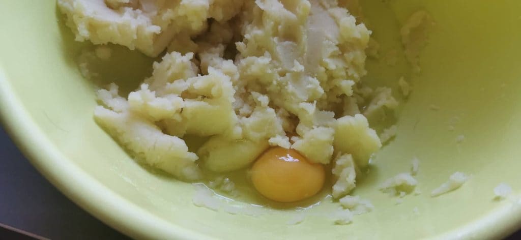 Sammeln Sie das Kartoffelpüree in einer Schüssel und bilden Sie eine Mulde in der Mitte.