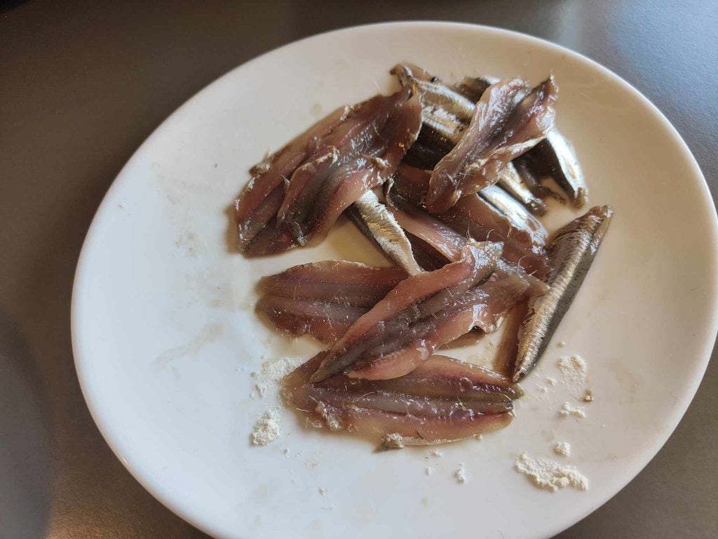 (Wie man Sardellen reinigt: Kopf zwischen Daumen und Zeigefinger nehmen und ziehen, leicht drehen, die Innereien kommen von selbst heraus.