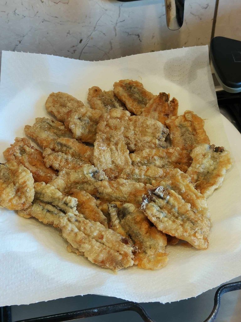 Die Sardellen werden sorgfältig gereinigt, abgetropft, in Mehl gewälzt und in geschlagenem Ei getaucht, dann frittiert und was für ein Genuss.