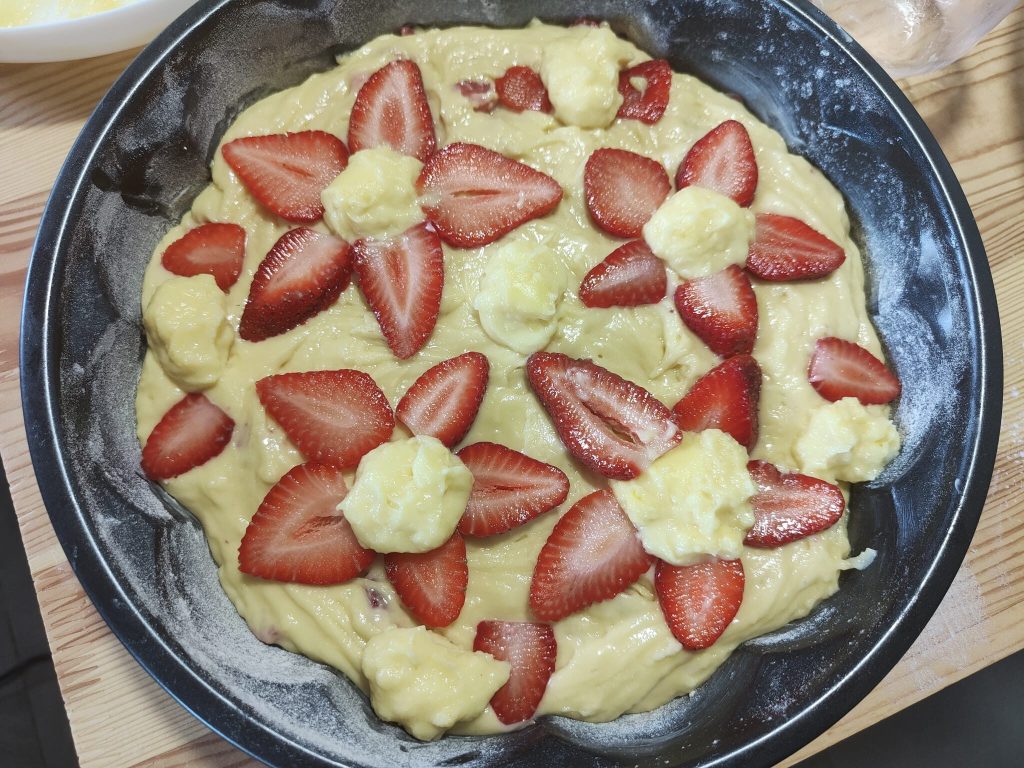 Den gesamten Inhalt in eine mit Butter gefettete und bemehlte 24/26 cm Backform gießen, die Oberfläche mit den restlichen Erdbeeren dekorieren.
