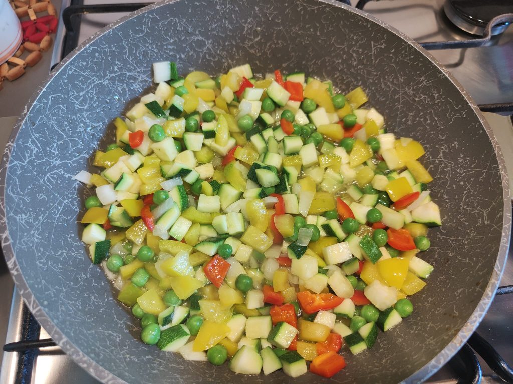 Fügen Sie zuerst die Zucchini und die Paprika hinzu, dann kurz danach die gefrorenen Erbsen.