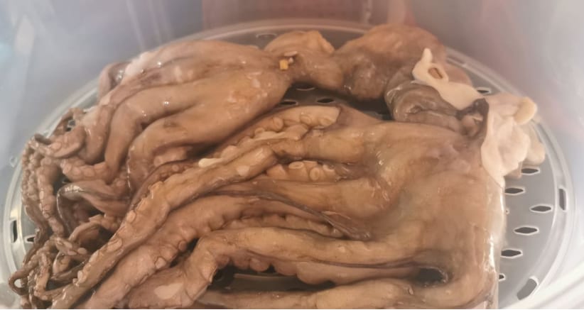 Außerdem sollte der Oktopus perfekt gegart in seinem eigenen Wasser bis zur vollständigen Abkühlung bleiben; während des Kochens sollte das Wasser nicht stark kochen, sondern leicht köcheln, um Temperaturschwankungen zu vermeiden.