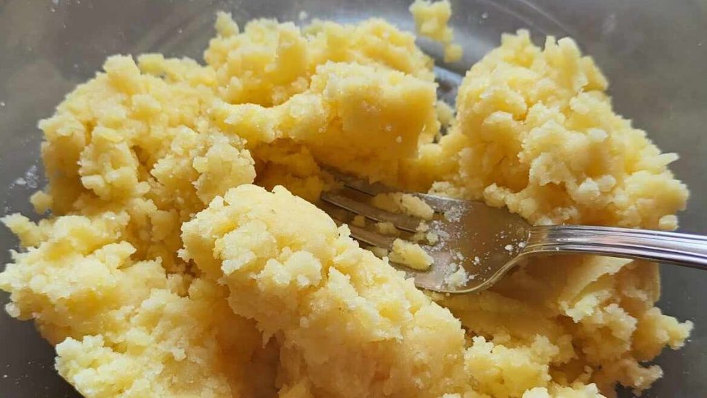 In den Teig habe ich zwei Esslöffel Kartoffelstärke eingearbeitet, die dazu dient, die Feuchtigkeit der Kartoffeln zu entfernen und das Püree zu binden. Reguliere die Menge erst, nachdem alles gut vermischt wurde.