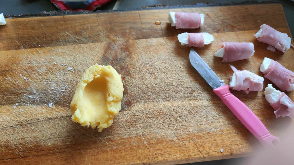Mit einer Gabel die Mischung gut vermengen, dann eine kleine Portion nehmen und in die Mitte einen Streifen Mozzarella und gekochten Schinken legen.