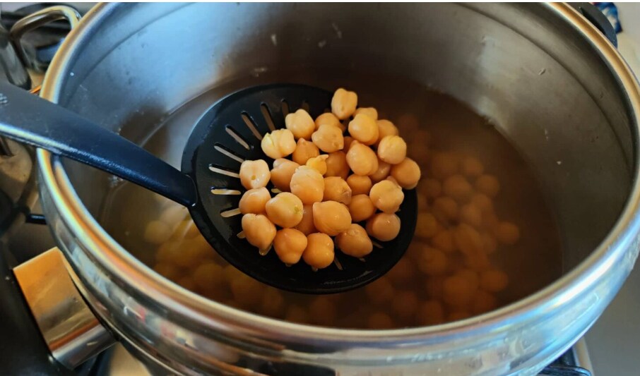 Um den Weichungsprozess der Kichererbsen zu erleichtern, können Sie dem Wasser eine Prise Natron hinzufügen, das hilft, die in den Hülsenfrüchten vorhandenen Fasern zu brechen.