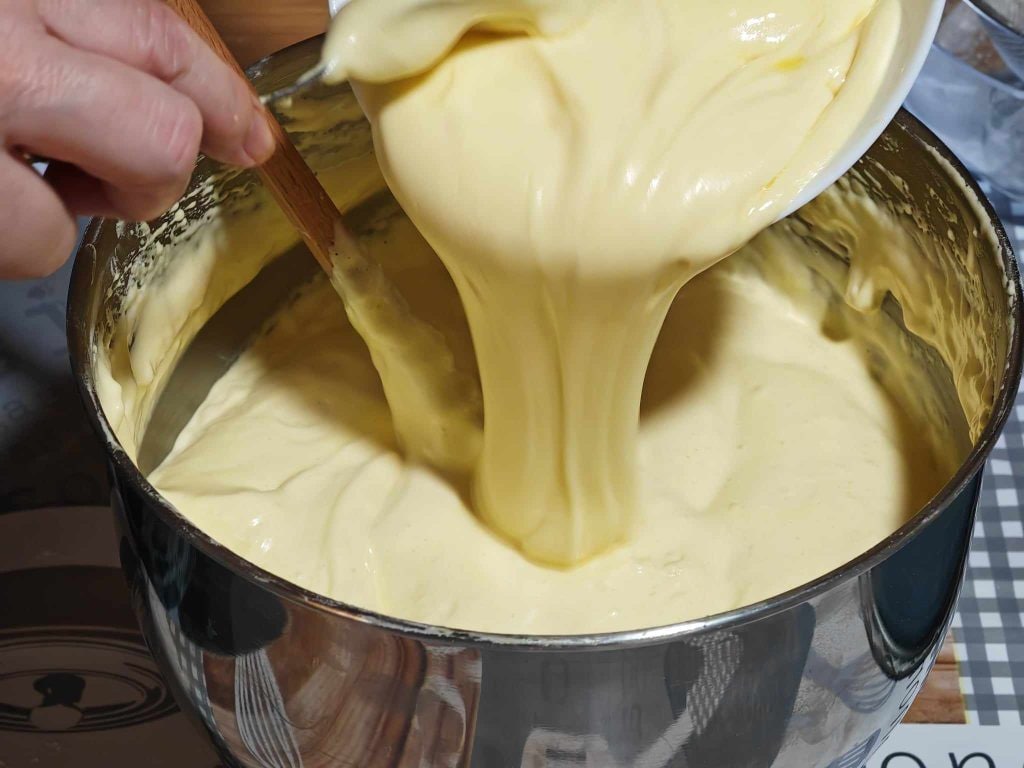 Vorsichtig mit einem Spatel von unten nach oben mischen, um die Mischung nicht zu entlüften.