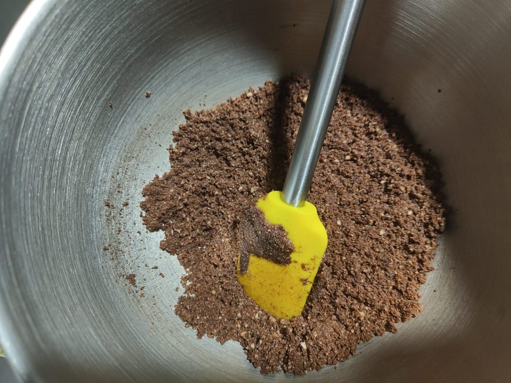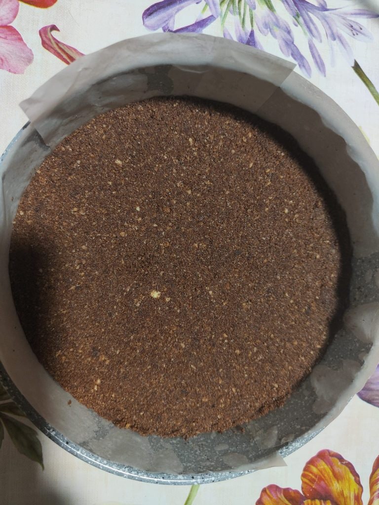 • Die Kekse fein zerbröseln und in eine große Schüssel geben, den Kakao und die geschmolzene Butter hinzufügen.