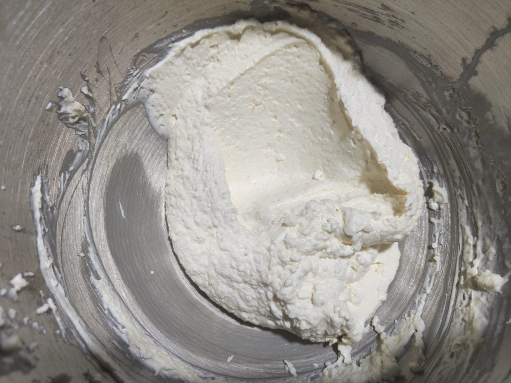 • In der Zwischenzeit die Creme zubereiten: 200 g Sahne schlagen, den Mascarpone und die Kokosraspeln hinzufügen