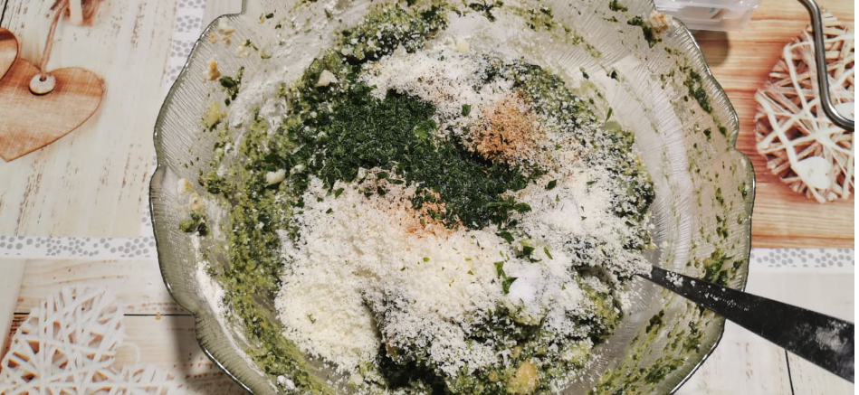 In einer Schüssel das Hackfleisch mit der gehackten Mortadella, der Petersilie, dem Knoblauch, dem Majoran und dem gehackten Mangold mischen, die Eier, die Käsesorten und die Semmelbrösel hinzufügen.