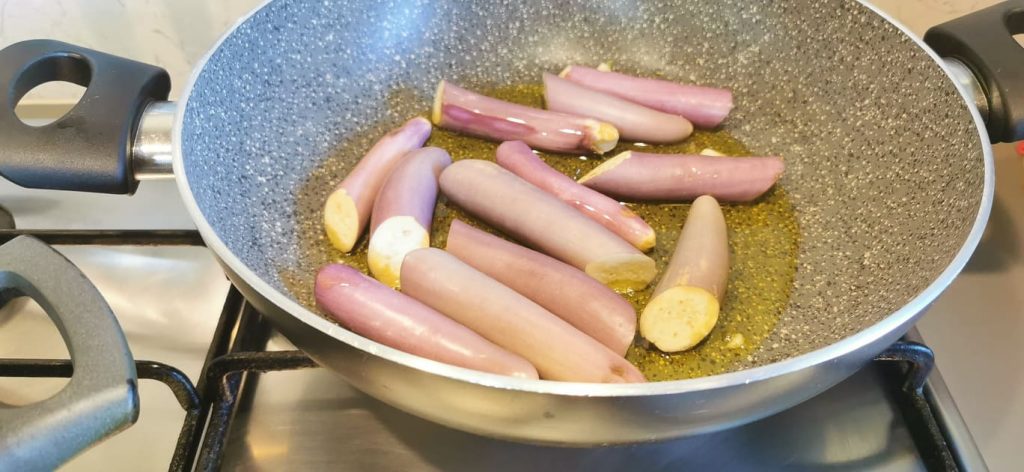 • Den Knoblauch entfernen und die Perlina Auberginen hinzufügen.