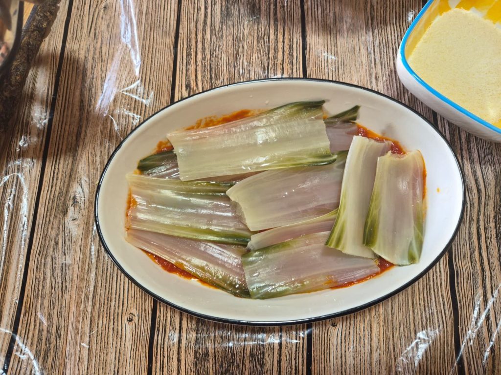 Dann eine Lage blanchierte Mangoldstiele nebeneinander auslegen.