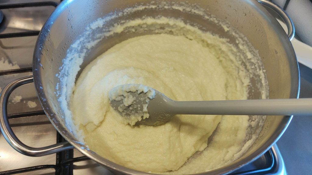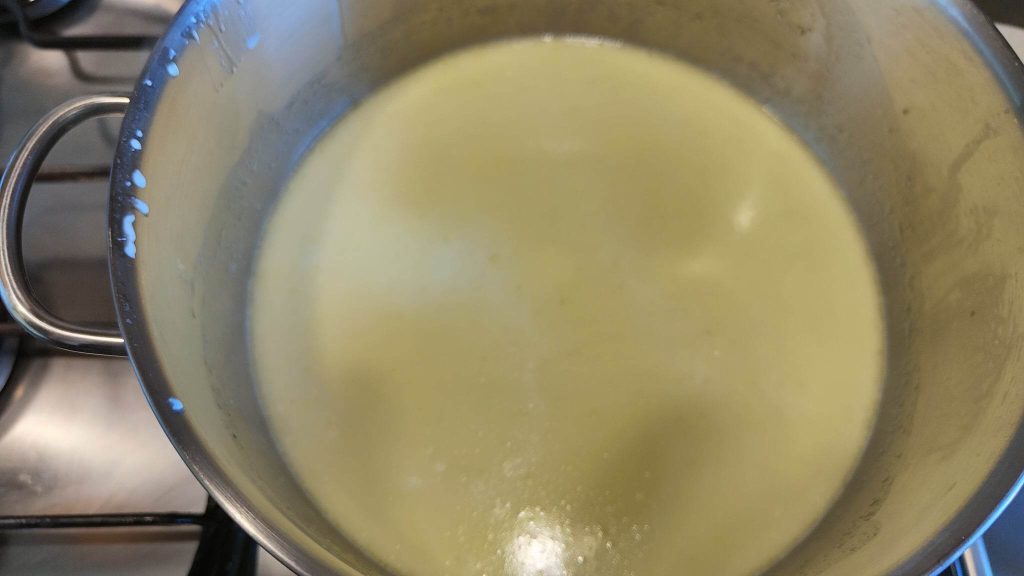 Milch, Wasser, Butter, Zitronen- und Orangenschale in einen Topf geben und für ein paar Minuten kochen. Alle Schalen entfernen und eine Prise Salz hinzufügen.