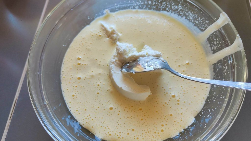 In einer separaten Schüssel die Eier mit dem Zucker schaumig schlagen bis ein helles und schaumiges Gemisch entsteht, das Vanillearoma hinzufügen.