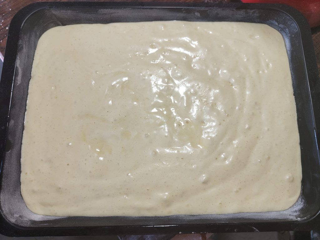 Die erhaltene Mischung in die eingefettete und mit Mehl bestäubte Form gießen. (Form 27X20).