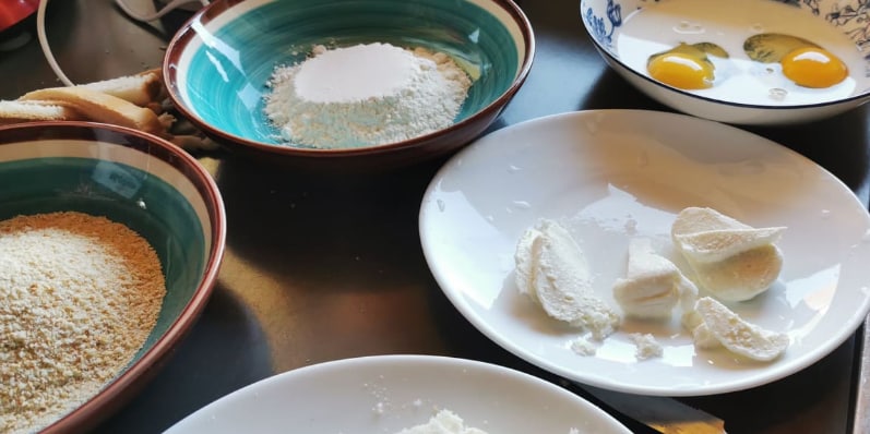 Um zu verhindern, dass der Mozzarella während des Kochens schmilzt, muss das Toastbrot gut paniert sein.