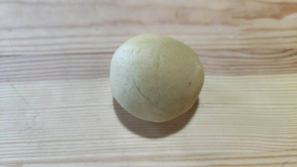 Nehmen Sie die weiße Mürbeteigkugel und rollen Sie sie aus, aber nicht zu dünn.