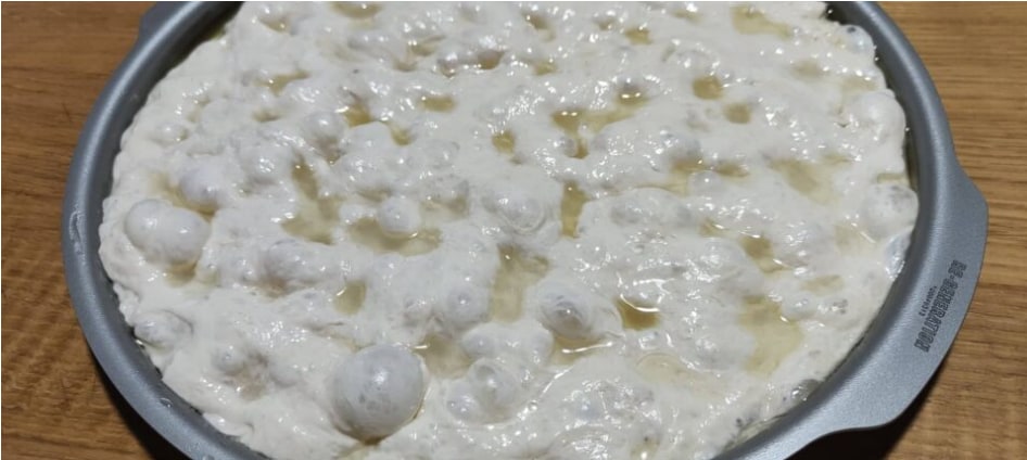 Verteilen Sie die Emulsion auf der Oberfläche Ihrer Focaccia und drücken Sie sanft mit den Fingerspitzen, achten Sie darauf, die Blasen nicht zum Platzen zu bringen.