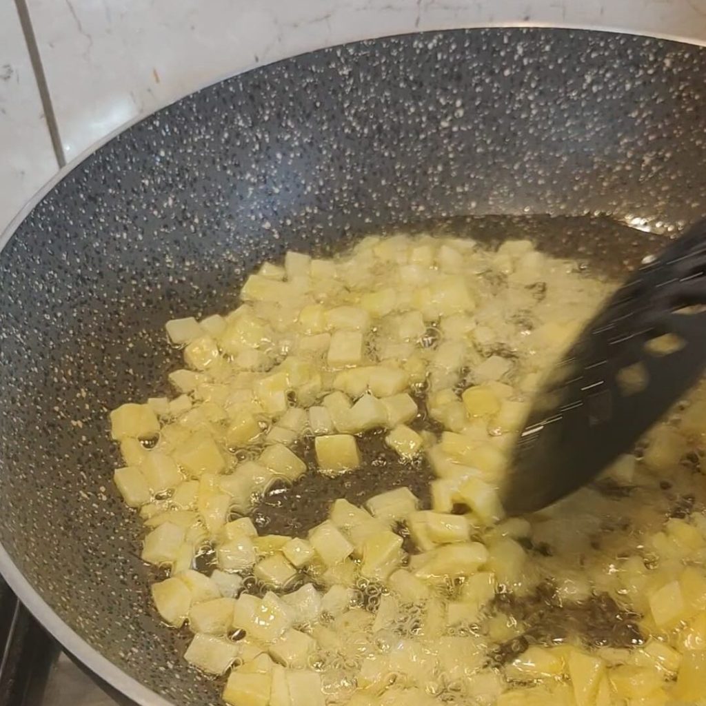 Das Öl in einer Antihaftpfanne erhitzen, die Kartoffeln portionsweise frittieren und in eine Schüssel mit Küchenpapier darunter legen, um das überschüssige Fett aufzusaugen.