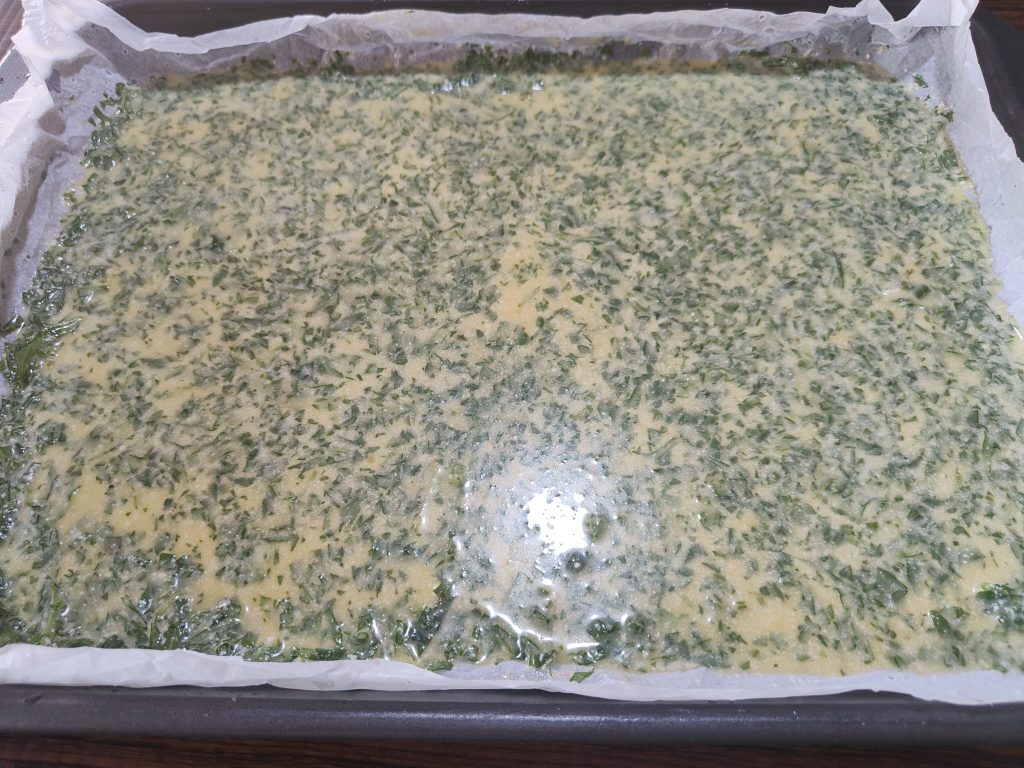 Ein rechteckiges Backblech nehmen und mit einem Blatt Backpapier auslegen.