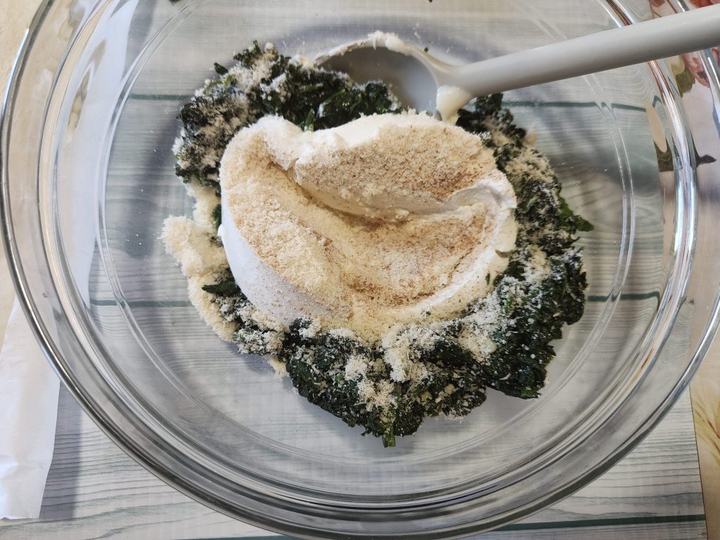 • In eine Schüssel geben wir den Spinat, bereits gekocht und ausgedrückt, und in der Pfanne getrocknet, um überschüssiges Wasser zu entfernen. Dann fügen wir den Ricotta, das Ei, den geriebenen Käse, das Salz und die Muskatnuss hinzu.