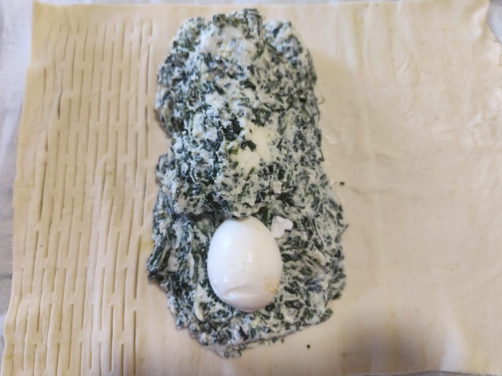 Die Ostertortenrolle ist ein Blätterteig mit der klassischen Füllung aus Ricotta, Spinat und Eiern, in diesem Fall hartgekocht und nicht roh, inspiriert von dem typischen Ostergericht aus Ligurien.