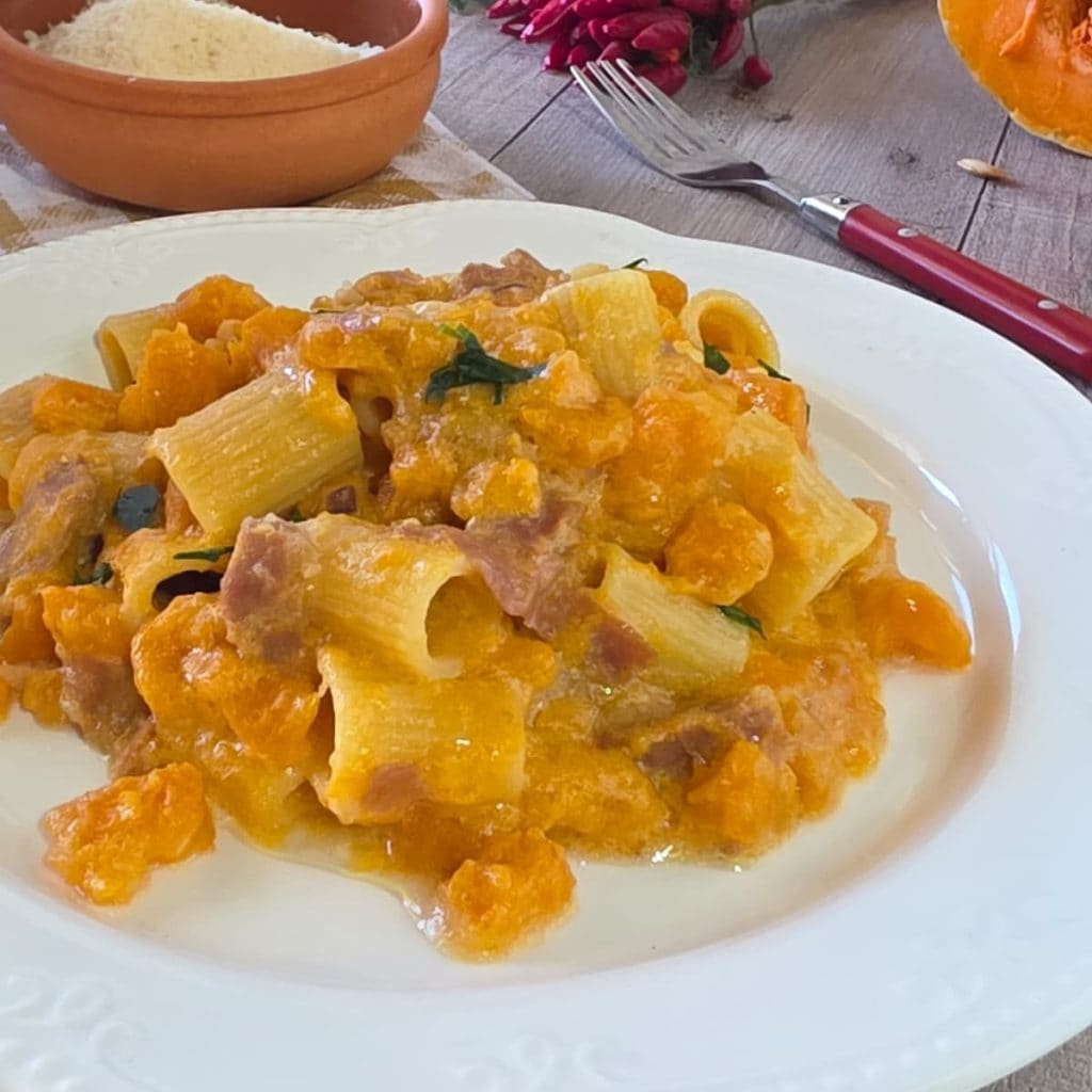 Die Pasta mit Kürbis, Speck und cremigem Gorgonzola ist köstlich, ein einfaches und cremiges Herbstgericht, das das Herz erwärmt.