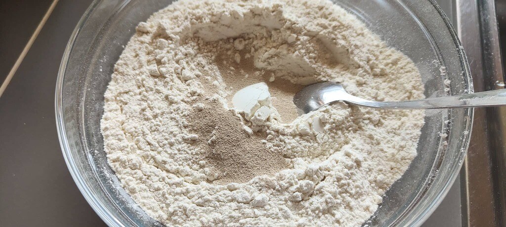Das Erste, was ihr tun müsst, ist, in eine Schüssel die beiden Mehlsorten, die Trockenhefe zu geben und das Wasser langsam hinzuzufügen.