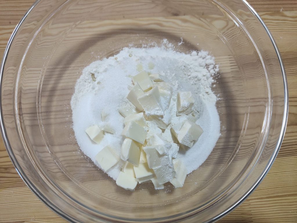 Zuerst mit dem Sanden beginnen: In einer Schüssel das gesiebte Mehl, den Zucker, das halbe Päckchen Backpulver, eine Prise Salz und die kalte Butter aus dem Kühlschrank, grob gewürfelt, sowie die geriebene Zitronenschale geben.