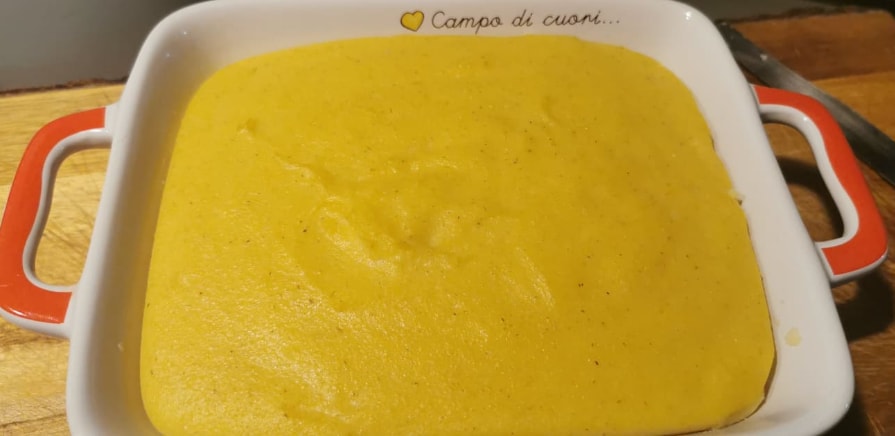 Wenn die Polenta gekocht ist, in einen Behälter gießen, aus dem ein Block geformt wird.