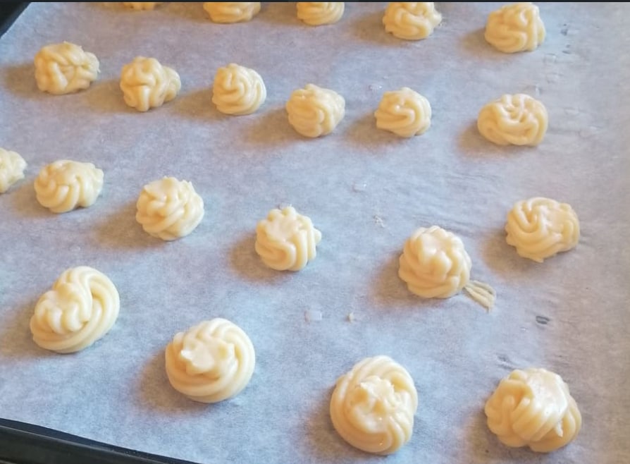 Den Brandteig in einen Spritzbeutel mit Tülle geben und gut auseinanderliegende Kugeln formen.
