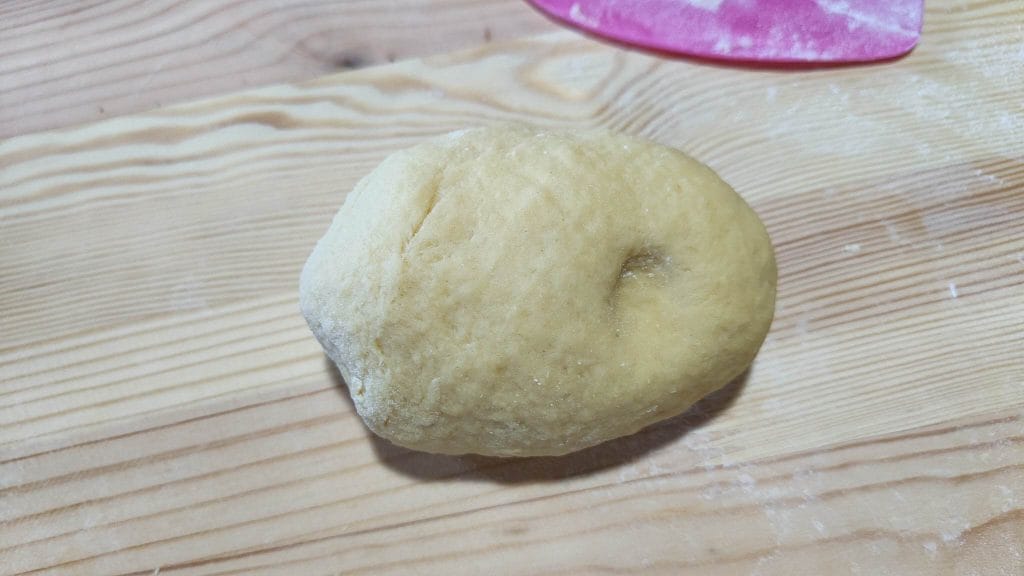 Zuerst mit der Gabel arbeiten, danach lange mit den Händen, bis der Teig trocken, fest und elastisch ist.
