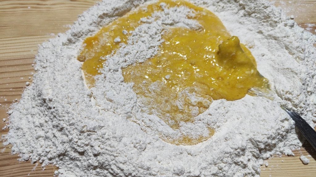 Nun, mit Hilfe einer Gabel, brich die Eier auf und beginne, das Mehl zu integrieren.