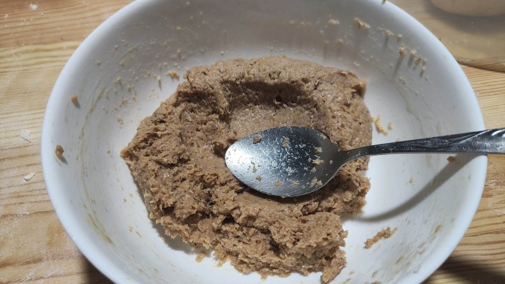 Wenn das Mehl teilweise eingearbeitet ist, kneten Sie mit den Händen.