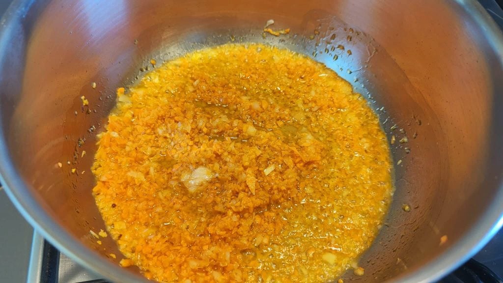 Zwiebel und Karotte hacken, in einen Topf mit dem Olivenöl geben.